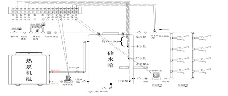 控制系統(tǒng):采用全自動控制,主機循環(huán)加熱蓄水水箱到60℃,水箱水位下降時,機組再自動開啟向水箱中補充水。