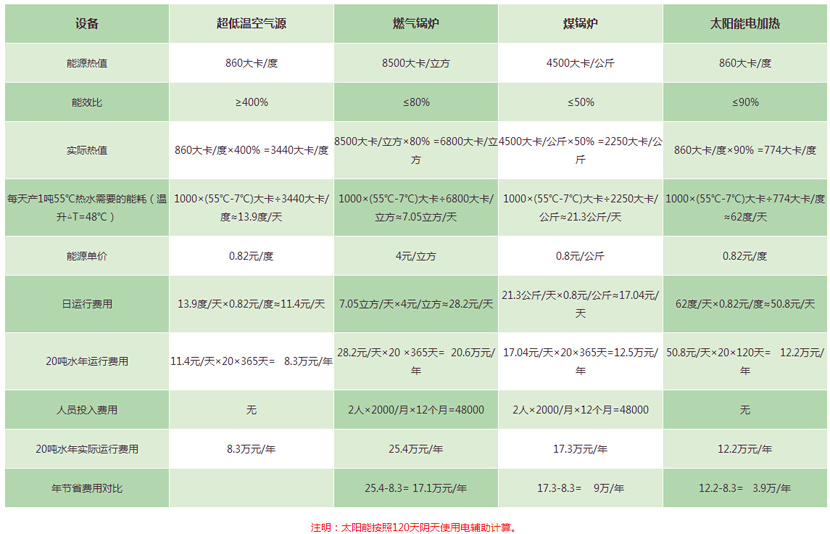 超低溫空氣源熱泵熱水器較電熱器節(jié)約近75%,較燃?xì)鉄崴鞴?jié)約59%、較燃油熱水器節(jié)約62%、較燃煤鍋爐節(jié)約30%、較太陽能熱水器節(jié)約28%的運行成本。